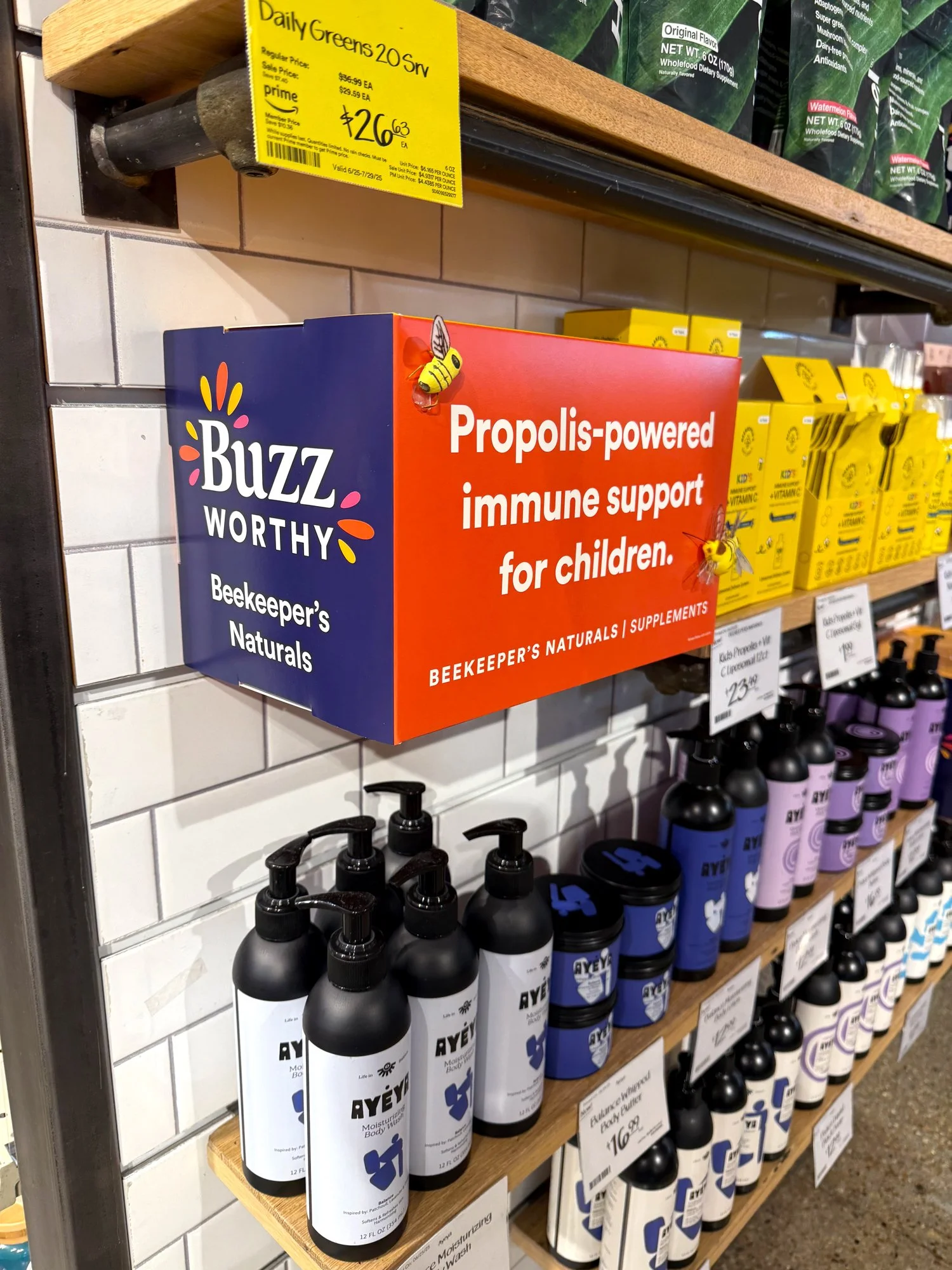In-store signage directing customers discover new and unique products at Whole Foods Market.